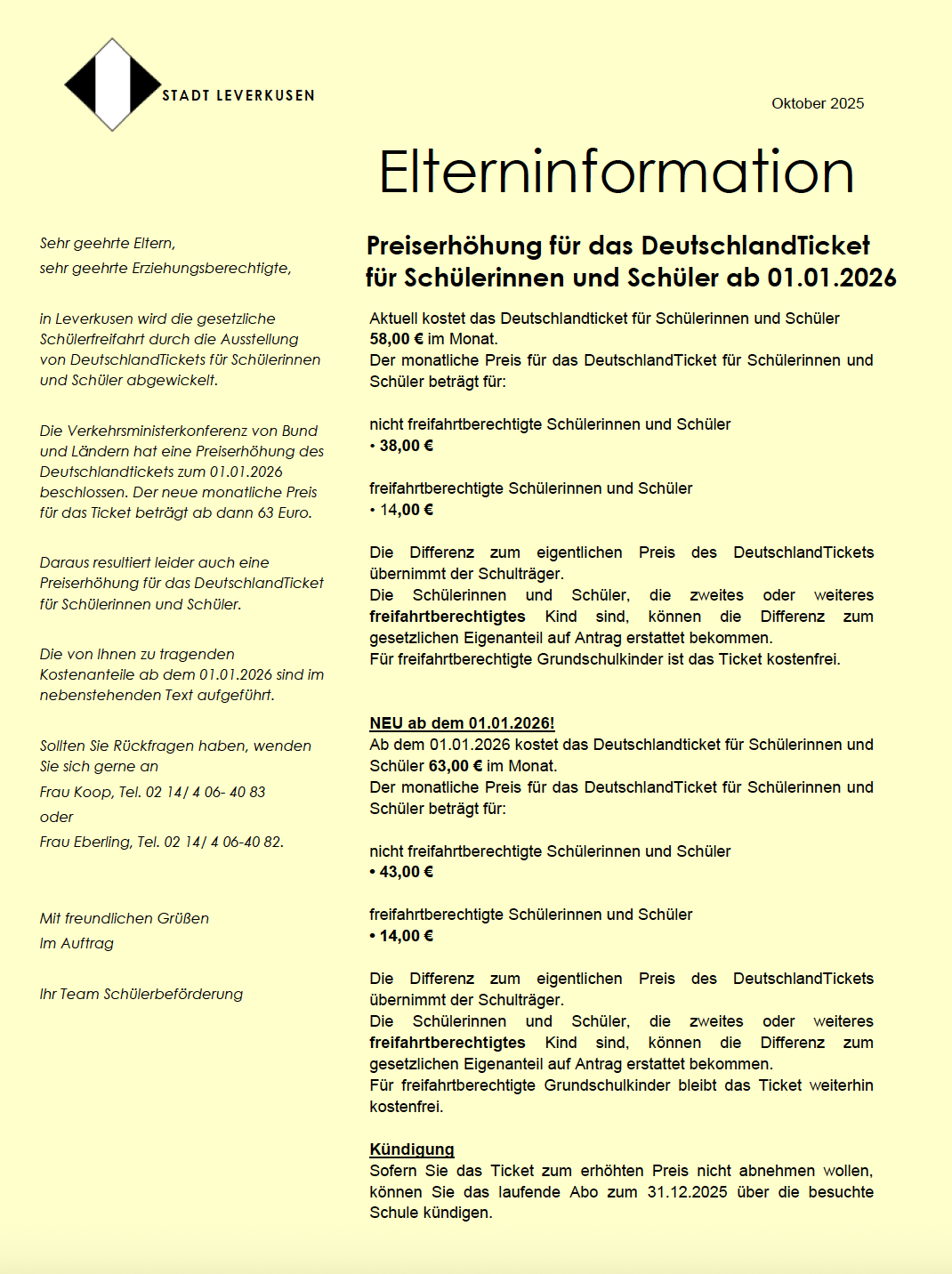 Elterninfo: Preiserhöhung für das DeutschlandTicket
