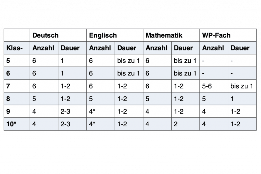 Am Ende der Klasse 10 finden in den Fächern Deutsch, Englisch und Mathematik zusätzlich Zentrale Prüfungen statt. Im 2. Halbjahr der Klasse 10 ist jeweils in den Fächern Deutsch, Englisch und Mathematik sicherzustellen, dass mindestens eine schriftliche Klassenarbeit zur Vorbereitung auf die Zentralen Prüfungen 10 geschrieben wird.