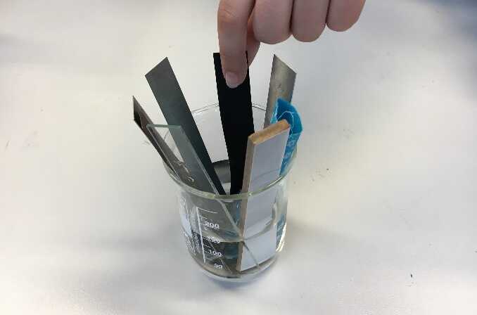 Die verschiedenen Stoffe stehen in heißem Wasser. Welche Stoffe leiten die Wärme gut und erhitzen sich schnell?