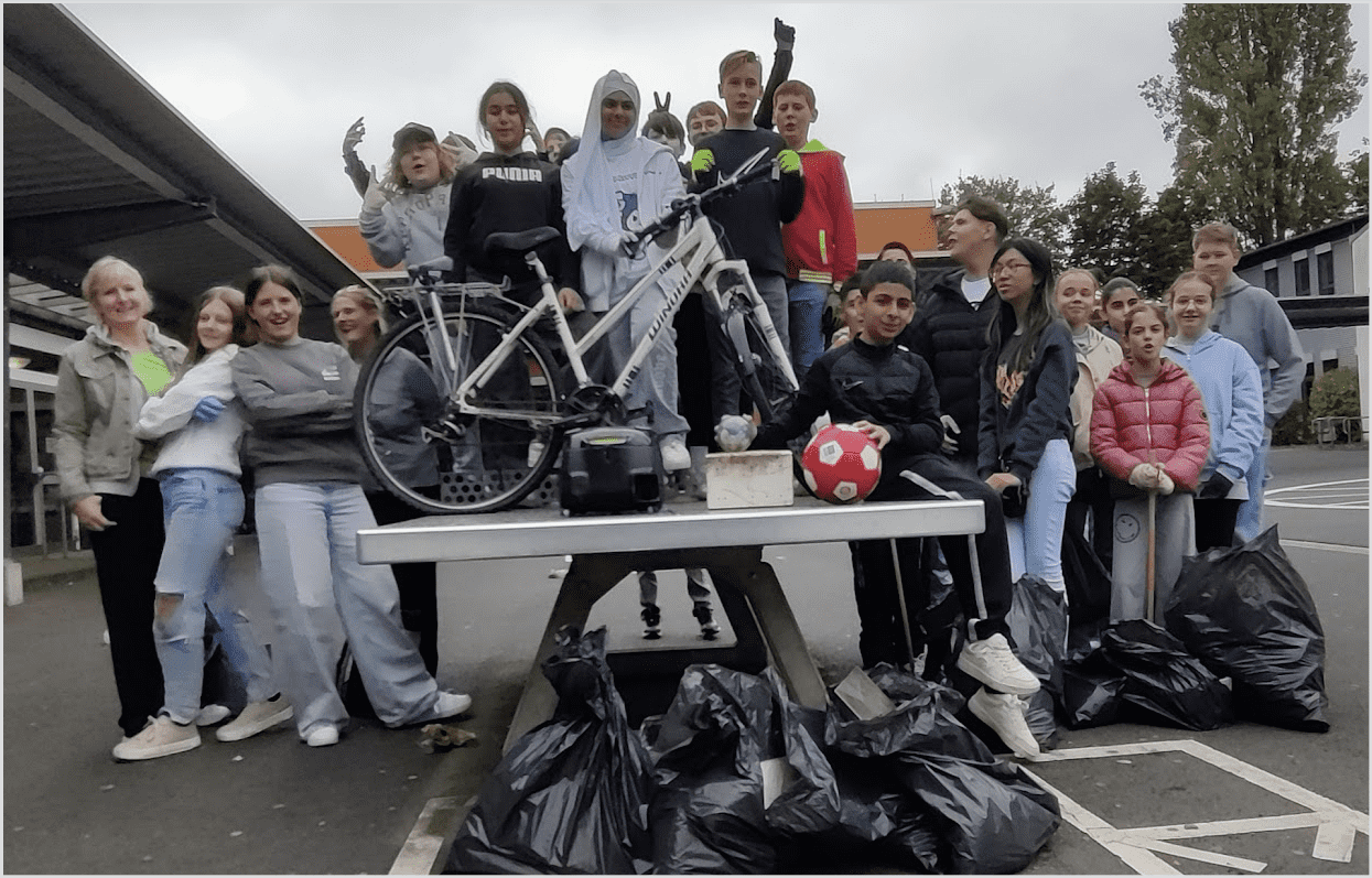 Circa 45 Säcke voller Müll haben die Schüler*innen des Jahrgang 7 und ihre Lehrer*innen rund um die Schule und den Oulusee eingesammelt. Auch ein Fahrrad, einen Staubsäuger, einen Fußball, einen Tretroller und ein Autokennzeichen haben sie aus dem Gebüsch gezogen.